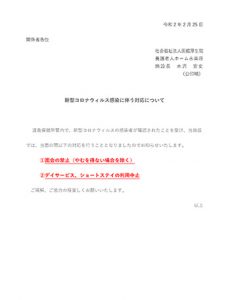 当施設では、当面の間以下の対応を行うこととなりましたので、お知らせ致します。