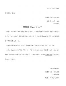 新型コロナウィルスの感染拡大防止に伴い、ご家族の皆様には面会の制限にご協力いただいておりますが、収束の目途が立たない中で、この度「Skype」を活用したWEB面会の準備を整えました。