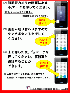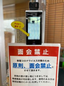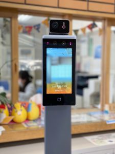 この度、感染予防対策の一環として、玄関に「顔認証式サーモセンサー」を設置いたしました。単独外出が可能なご利用者様の顔を登録し、センサーに顔をかざすことで自動ドアが開き、体温は自動で測定・記録され、外出後の発熱に早期対応する仕組みとなっております。