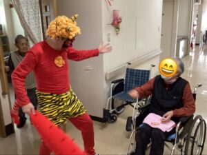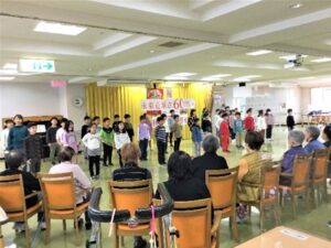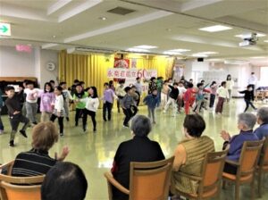 本年度、当施設「養護老人ホーム永楽荘」と名称し60年目(前身:豊寿寮、養老院等)高丘町へ移転30年目を迎え、お祝いに高丘小学校2年生が歌と踊り、市立函館高等学校チアリーディング部と技能実習生がダンスを披露してくれました。子供達との交流は4年ぶりとなります。ご利用者より心に残る貴重な時間を過ごすことができたと涙する場面や元気をいっぱい頂いたことに感謝の声とアンコールの声援で大絶賛でした。今も幸福感と笑顔がこぼれ日々の生活の活力に繋がる日となりました。また遊びに来る日を楽にみにしております。