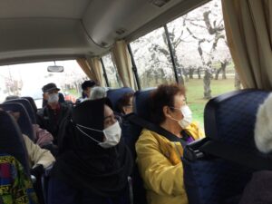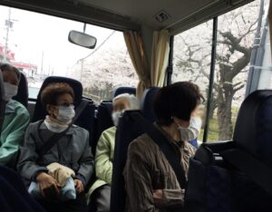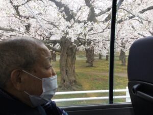 入所部門は令和6年4月24日(水)にお花見ツアーを開催しました。今年は観賞場所での記念撮影や30分間の自由時間を設けておりましたが、お花見当日はあいにく気温が低く、風も強かった為、ドライブツアーへ切り替えました。五稜郭公園・桜が丘通の桜並木方面をドライブし、満開の桜を見ながら、車内では「今年も見られて良かった。」などの感想や拍手で喜びを表現されるご利用者様もおり、春の季節を感じることができました。